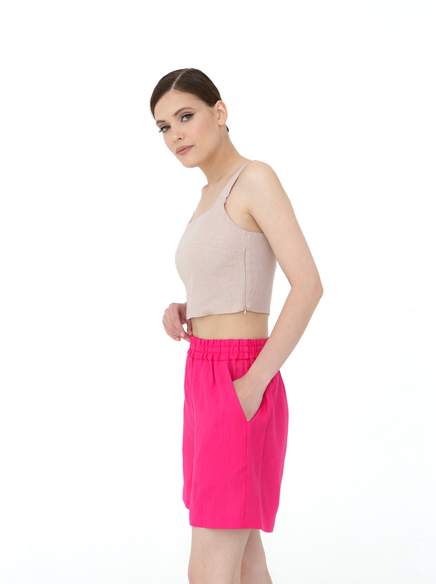 Топ отлично сочетается с юбками, шортами и брюками из льна или хлопка. Для повседневного образа — с сандалиями и легкими аксессуарами, для более элегантного — с жакетом и обувью на каблуке. Подходит для прогулок, отдыха и летних поездок.
