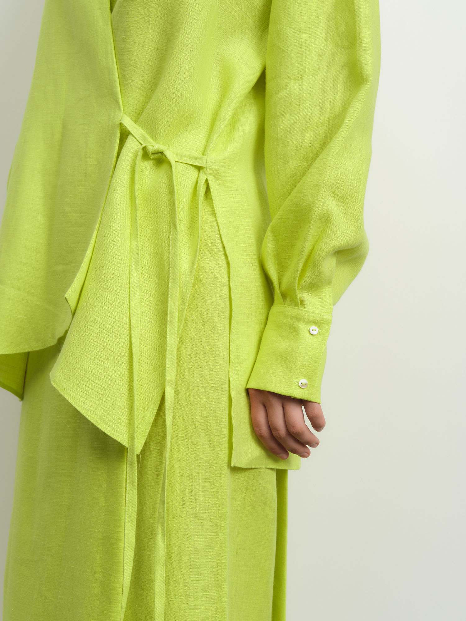 Модель с запахом и завязками, длинные рукава с манжетами, легкая фактурная ткань, аккуратные швы.