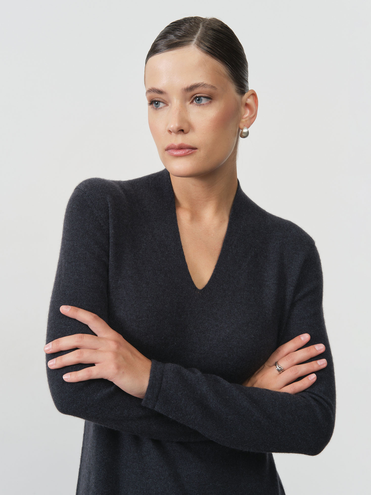 Модель выполнена в полуприлегающем силуэте с V-образным вырезом и длинными рукавами. Крой подчёркивает фигуру, сохраняя удобство и свободу движений.